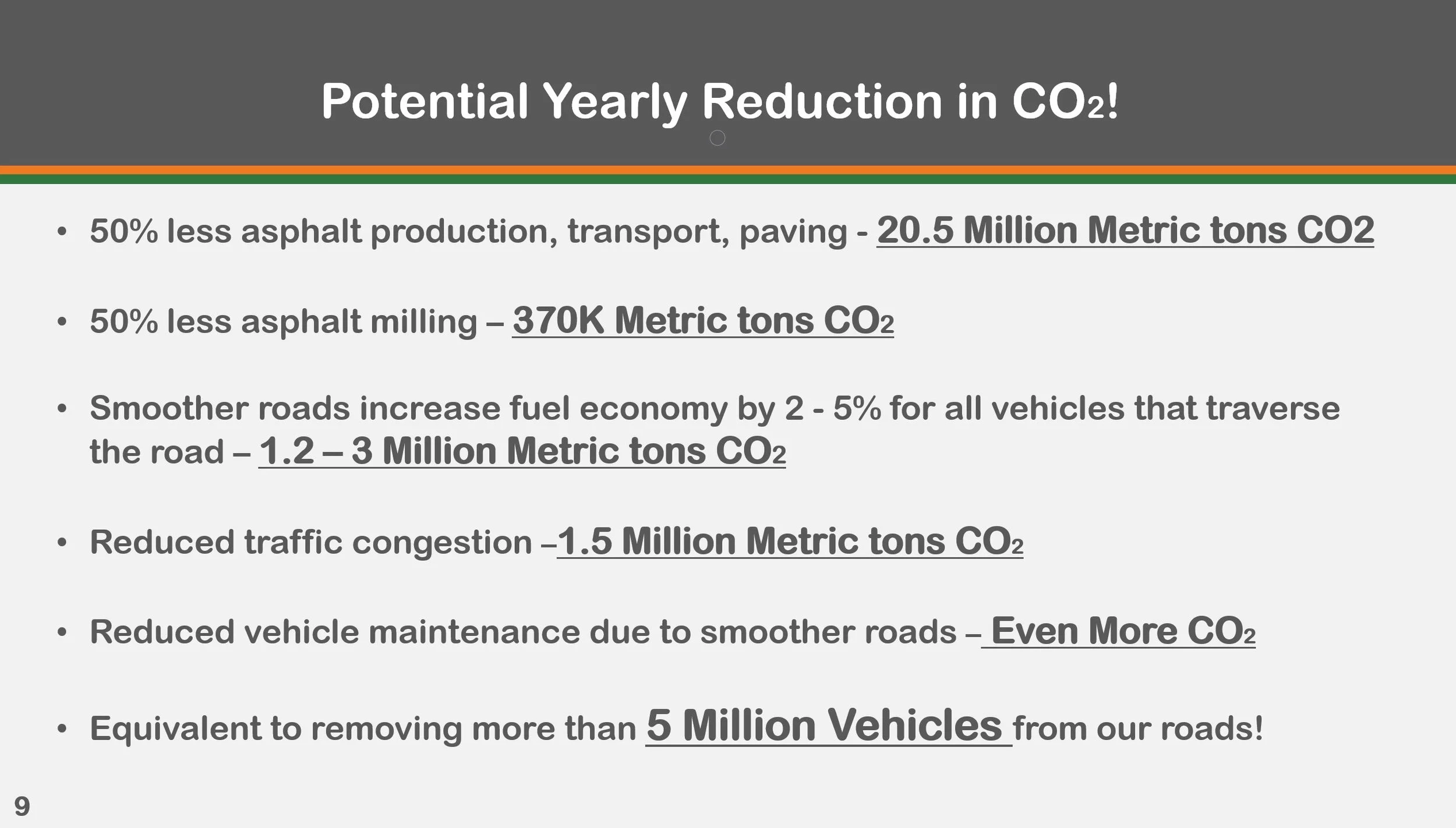 Based on the current 90 Million Tons of asphalt that are reprocessed every year in the U.S. alone we’re talking about a substantial reduction in green house gas emissions!