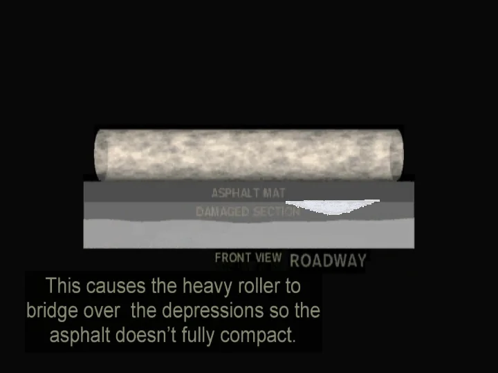 For example, if a flat layer of asphalt is laid down over an existing road surface that has typical road deformities (such as bumps, dips or ruts), they don't deliver enough material over the depressions. So when the heavy roller comes along the material around the depression compacts first, causing the roller (with its flat compacting surface) to bridge over the depression and the asphalt material doesn't fully compact. When this happens, either the material continues to compact over time and the original depression re-appears, or it starts to crack.